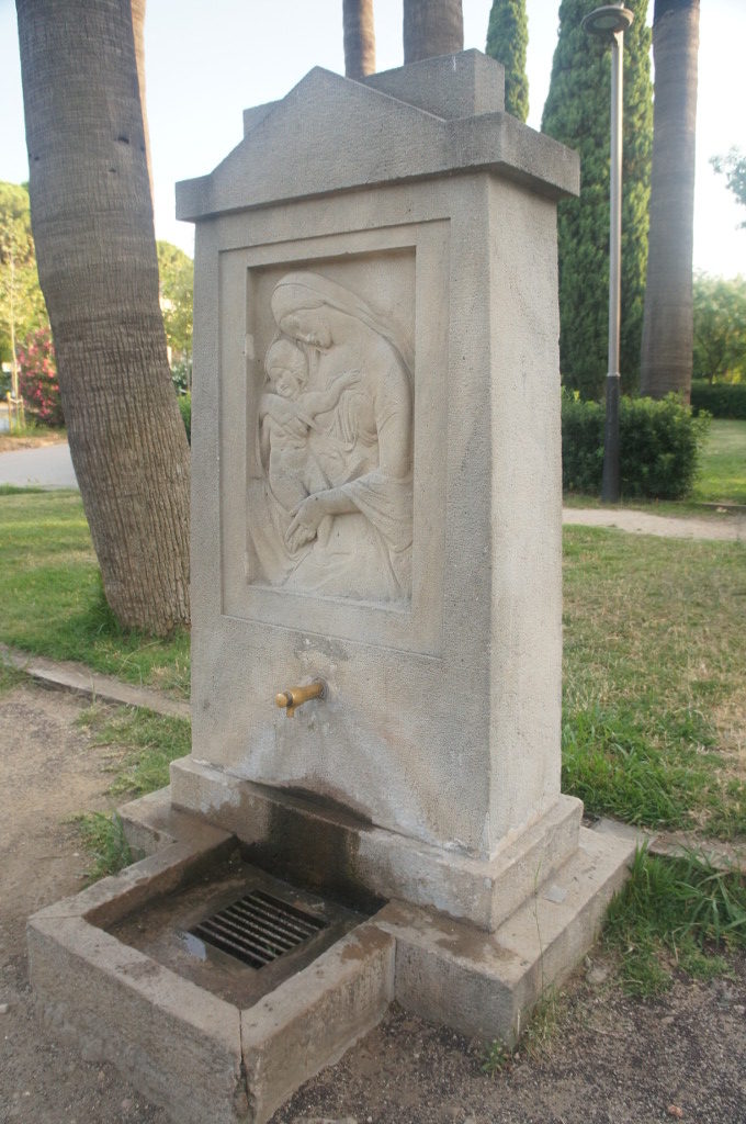 Als jardinets davant del Poble Espanyol trobarem la font de la Maternitat, obra de Joan Borrell i Nicolau de 1929.